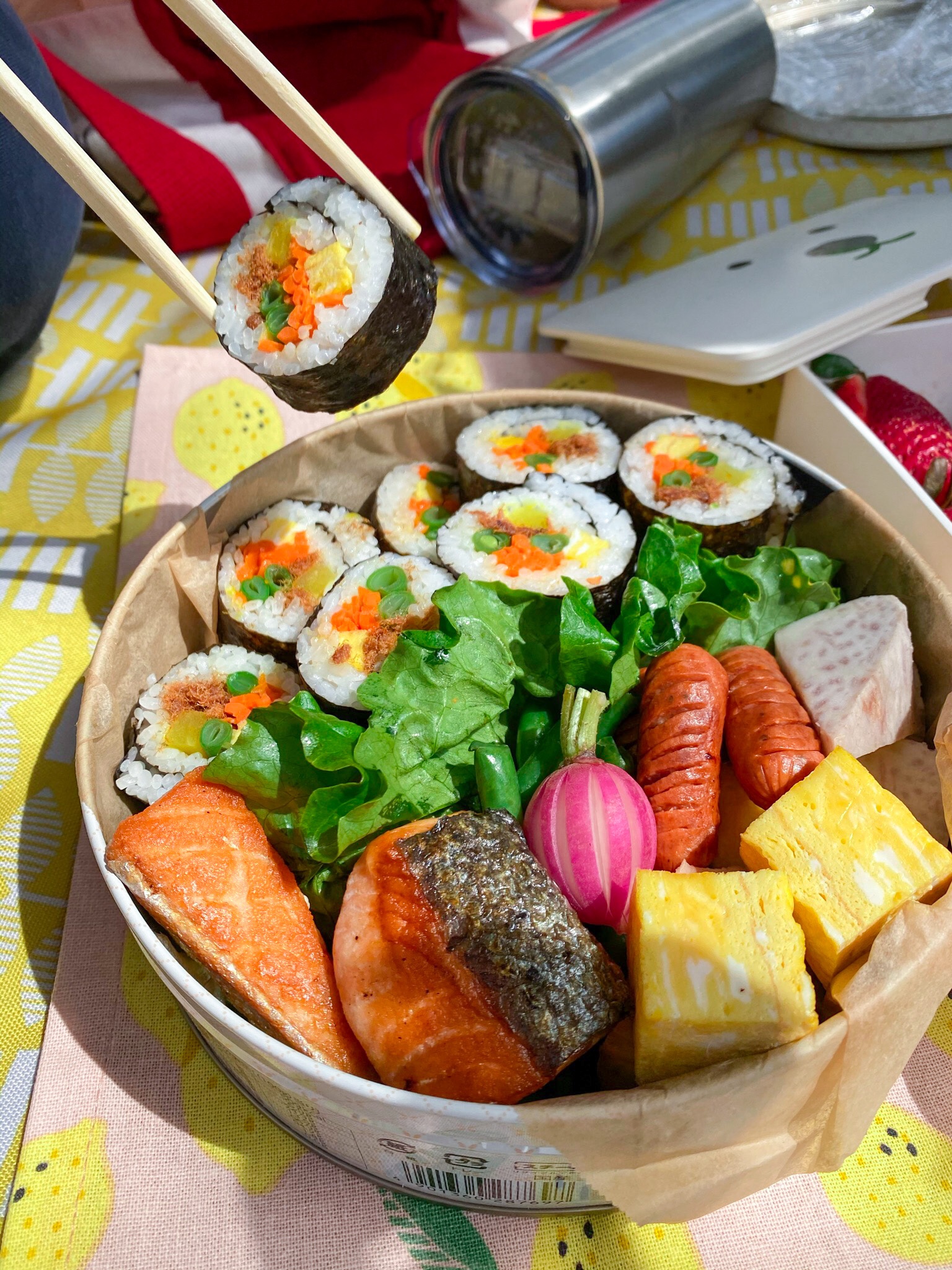 What to do when your egg roll doesn’t keep the shape, or when you accidentally run out of nori sheet or even rice? Accident happens, and it’s okay. Use your creativity and improvise something new! After all, it’s not a cooking contest but a chilled picnic. Just Relax!